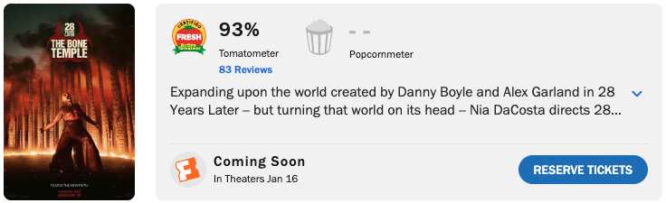 本記事時点でレビュー件数は83件、スコアは93%のフレッシュ認定スタート。シリーズ最高スコアをマークした。前作『28年後…』は89%、オリジナルの『28日後…』(2003)は87%、『28週後…』(2007)は73%。