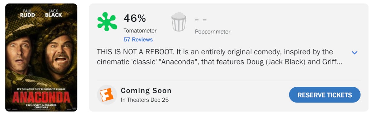 2025年12月25日に米国公開される本作は、本記事時点でレビュー件数は57件。批評家スコア44%というやや厳しい滑り出しとなった。もっとも、1997年のオリジナル版『アナコンダ』は39%、続編『アナコンダ2』(2004)は26%。その後の続編はスコアが発表されていないため、シリーズ史上もっとも評価の高い作品となる可能性もある。