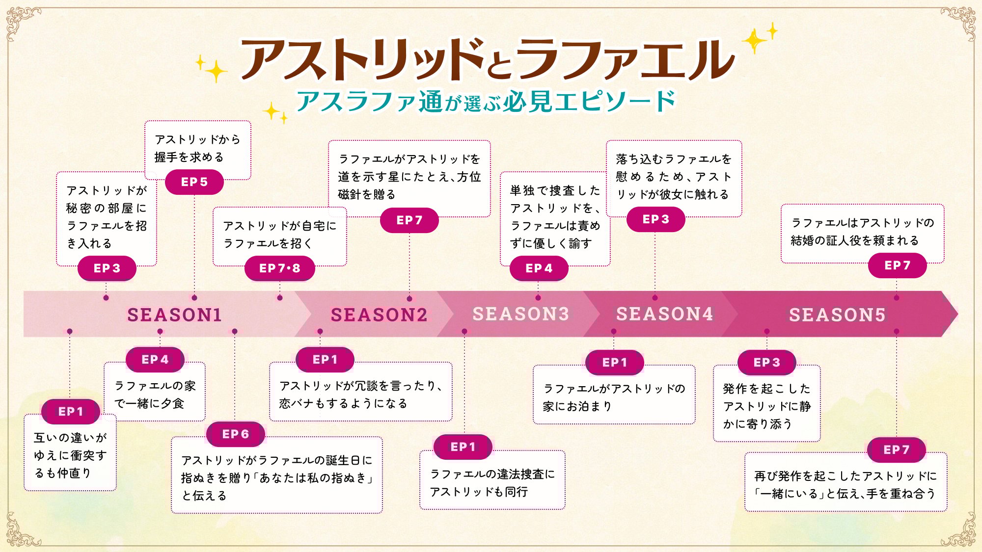 この関係を象徴するのが、「指ぬき」と「方位磁針」だ。シーズン1でアストリッドはラファエルに「指ぬき」を贈り、“自分を守ってくれる存在”としての信頼を示す。対するラファエルは、シーズン2でアストリッドに「方位磁針」を贈り、“自分を導いてくれる存在”という敬意を込める。この2つのアイテムは、彼女たちが“保護する側/される側”という関係を超え、対等なバディへと進化したことを物語っている。