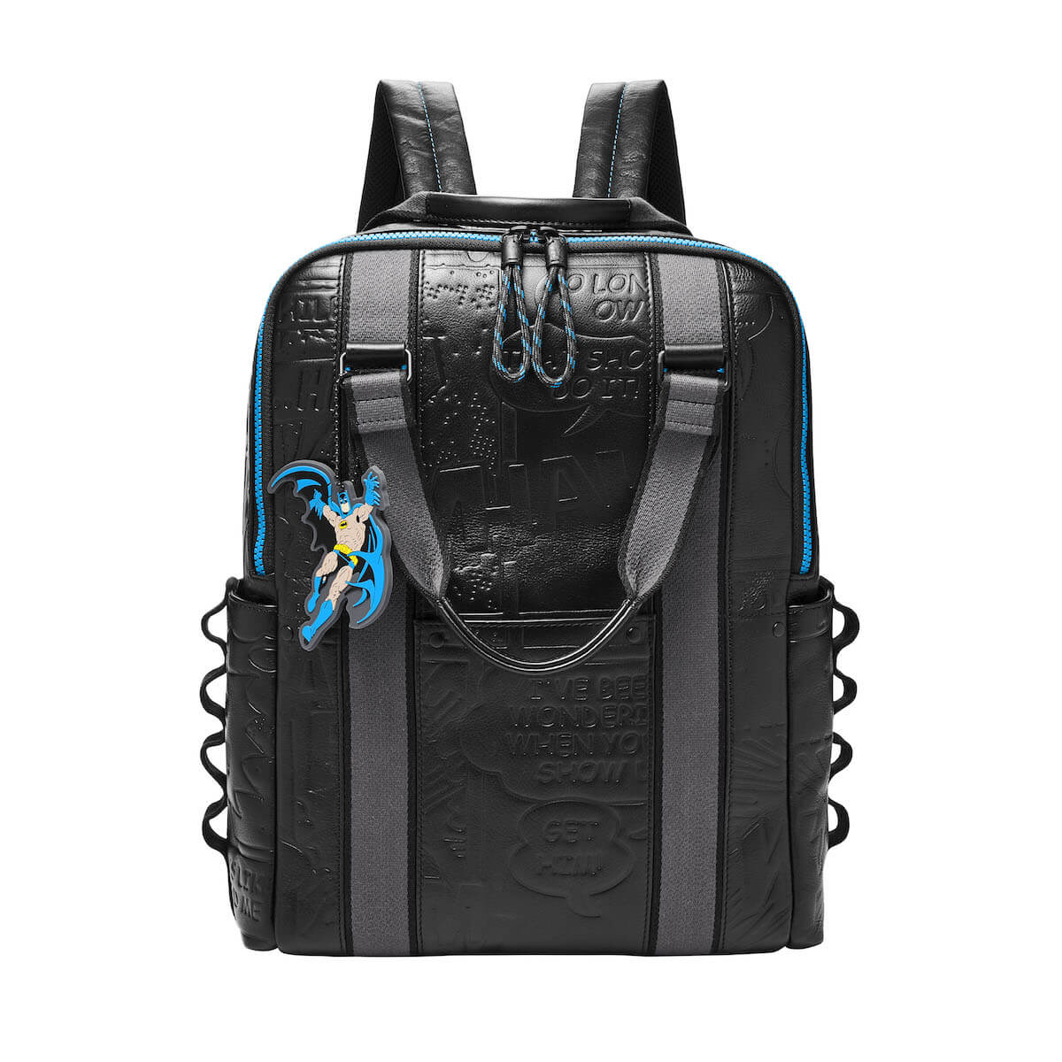 バットマンのレザーグッズは、バックパック、財布、キーチェーン、ピンセットの限定品。バックパックは、ヴィンテージコミック柄のエンボスレザーにバットマンブルーのス