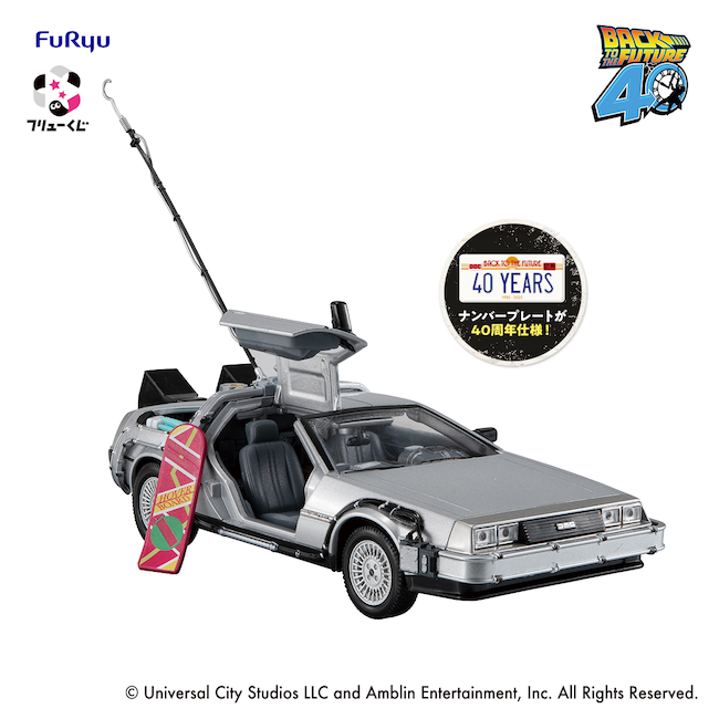 A賞、『ダブルゲット』賞には、シリーズ第1作目「バック・トゥ・ザ・フューチャー」の「TIME MACHINE」が1/24スケールのダイキャストモデルで登場。タイヤは回転、ドアは開閉可能で、『フリューくじ』オリジナルホバーボードが付属。さらに、ナンバープレートは40周年仕様でコレクション性も抜群だ。