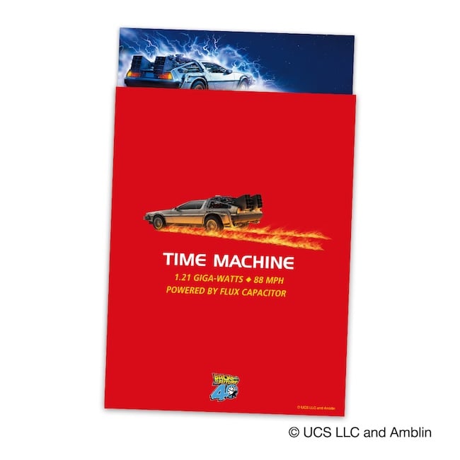 タイムサーキット型時計の背面やスポーツ年鑑風カバー、ミニブックには、『バック・トゥ・ザ・フューチャー』40周年のロゴ入り。今しか手に入らないスペシャルなアイテムだ。5,390円(税込)。