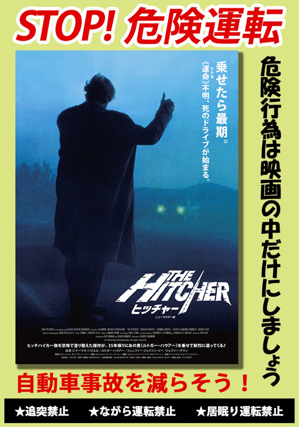また、コラボレーション動画にあわせて交通安全ポスターも公開されている。ポスターでは『ヒッチャー』『クラッシュ』、それぞれの新ビジュアルをメインに起用し、危険運転の防止と自動車事故の根絶が訴えられている。危険な行為は映画の中だけにしよう。