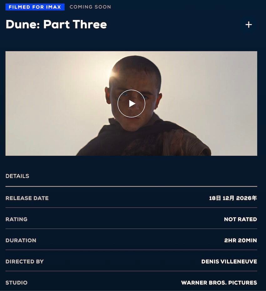 ティモシー・シャラメ主演のSF超大作『デューン』シリーズ完結編『デューン 砂の惑星PART3』の上演時間は、米IMAX公式サイトによると2時間20分となるようだ。これはシリーズ最短となる。