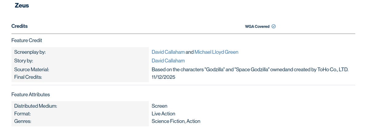 このたび西部全米脚本家協会(WGAW)のデータベースにて、本作のワーキングタイトル(内部用仮タイトル)である『ゼウス(Zeus)』の項目に、「原作」として「東宝株式会社が創作・所有するキャラクター、“ゴジラ”および“スペースゴジラ”に基づく」という記述が発覚。これによって、スペースゴジラの登場が非公式発表ながら判明した形だ。