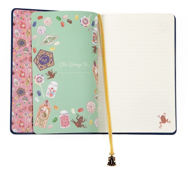 ベルベットリボンのスピン(しおりひも)に、カエルチョコレートのエナメル加工メタルチャーム付き。ノート部分はオールカラーで、カエルチョコレートやバーティー・ボッツの百味ビーンズなどハニーデュークスのお菓子があしらわれている。罫線入りのページになっており、日記や雑記、レシピノートなどさまざまなメモや記録を記すのにぴったり。