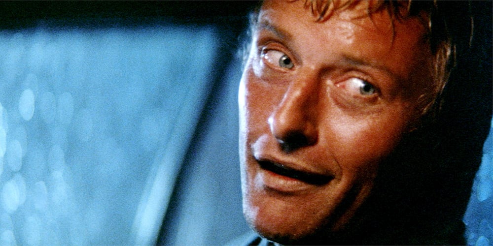 この度、鮮やかに蘇った本作の予告編が公開。雨降る夜、クルマを走らせる青年ジム(C・トーマス・ハウエル)が1人のヒッチハイカー(ルトガー・ハウアー)を拾う場面から始まる。