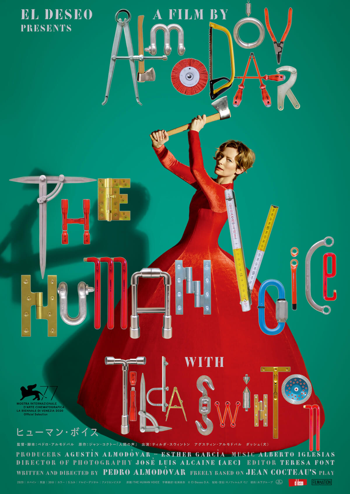 またポスタービジュアルでは、バレンシアガの真っ赤なドレスを身にまとったティルダ・スウィントンが斧を振りかざす姿が目を引く。さらに、ペンチや糸鋸といった様々な工具でタイトルや監督とティルダの名前が形作られ、アーティスティックな雰囲気の中にどこか狂気さえも感じる独特なデザインとなっている。