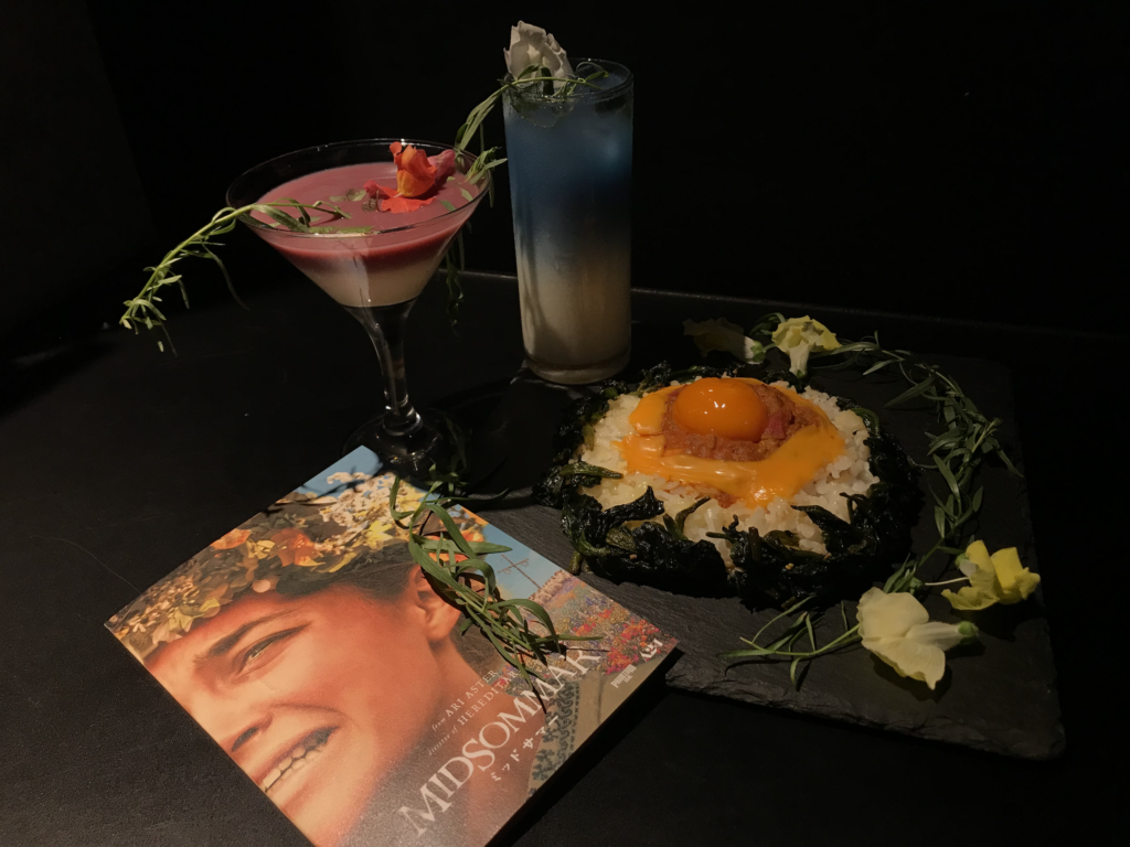 映画に登場するカクテルやフードはもちろん、シーンビジュアル、各種ポスターの展示、店内スクリーンではトレイラー上映など『ミッドサマー』の世界観に浸れる空間となる。