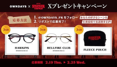 Stranger Thingsとのコレクション発売を記念して『OWNDAYS × Stranger Things』Xプレゼントキャンペーンを開催。OWNDAYS公式Xアカウントをフォローのうえ、対象のキャンペーン投稿をリポストすると応募完了。引用リポストで作中の好きなシーンについて投稿いただくと、当選確率がアップ。