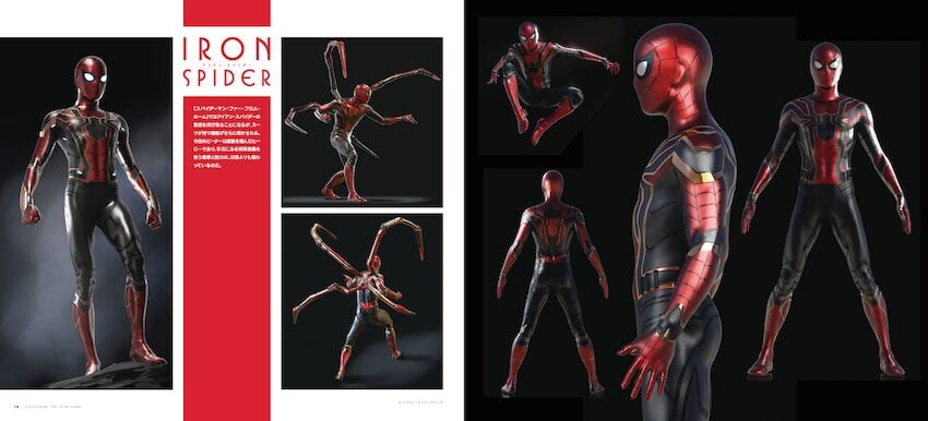 スパイダーマンがいくつものスーツを身にまとうのも本作の見どころの一つだ。本書では、再び登場したアイアン・スパイダースーツ、「ナイトモンキー」と呼ばれたステルス・スーツ、そしてトニー・スタークの技術によってアップグレードされたハイテクスーツのコンセプトアートも多数収録されている。