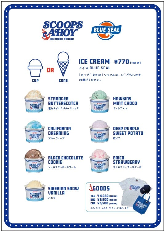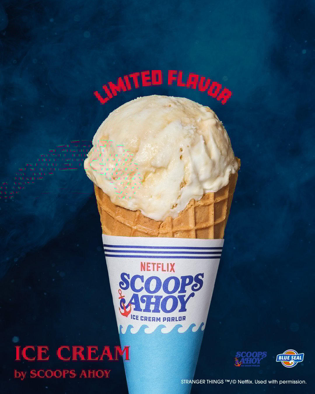 「ストレンジャー・シングス」に登場するアイスクリームショップ「Scoops Ahoy」にも登場する「バタースコッチ」を、ブルーシールの人気NO.1フレーバー「塩ちんすこう」と組み合わせた限定フレーバーを数量限定で販売。