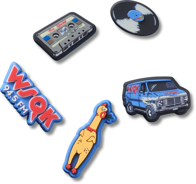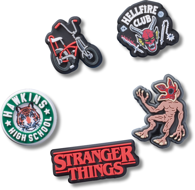 ジビッツ(TM) チャームのセットも販売。「ネットフリックス・ストレンジャー・シングス 5パック」はストレンジャー・シングスのロゴやデモゴルゴンをモチーフにしたダークなアイテムだ。また、「ストレンジャーシングス スクウォーク5パック」にはWSQKラジオ局をモチーフとしたノスタルジーな雰囲気のジビッツ(TM) チャーム。自由にカスタマイズでき、自分だけのスタイルを作ることができる。