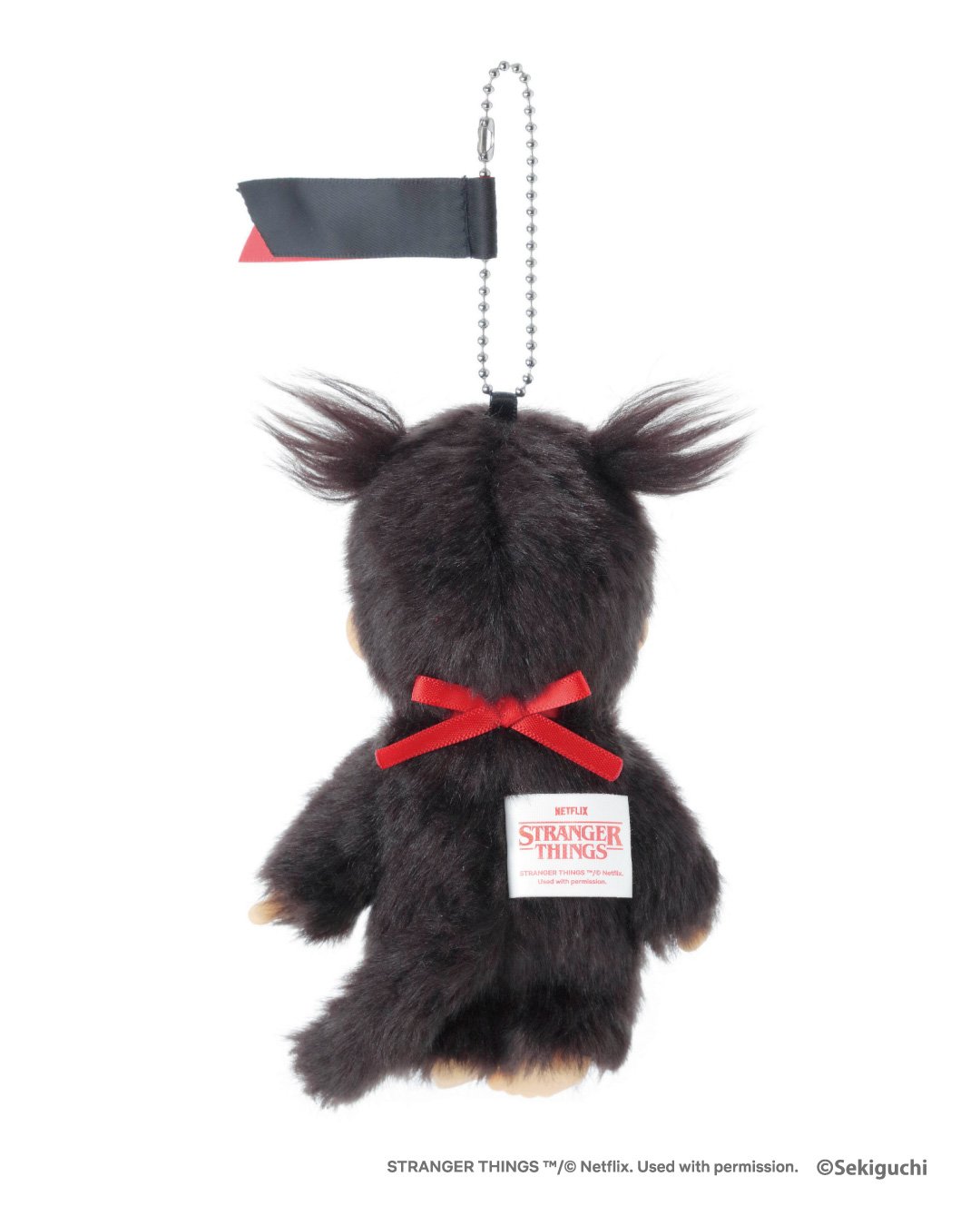 「Stranger Things」のロゴを引き立たせ、作品のダークでミステリアスな世界観を黒×赤のツートーンで表現しました。モンチッチの象徴であるスタイルックをベースに、シンプルながらも存在感のあるデザインに仕上げています。ツインテールを立たせるとまるでエルのようなパワーが(?)世界観のコントラストが際立つ、特別感あふれるアイテムです。3,300円(税込)。
