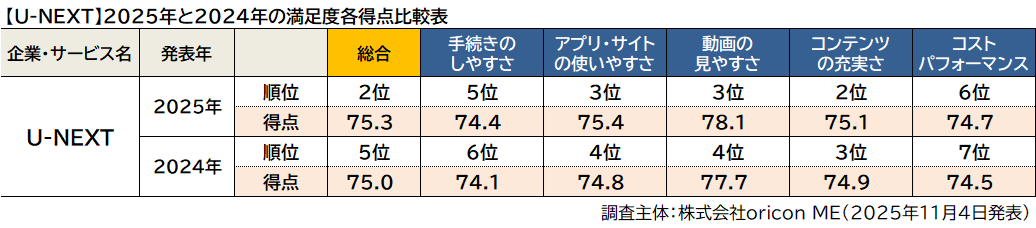 Netflixは評価項目別ランキングでも全5項目中「アプリ・サイトの使いやすさ」「動画の見やすさ」「コンテンツの充実さ」の3項目で1位に。なかでも、利用者が重視する傾向が最も高い評価項目「動画の見やすさ(79.9点)」での得点が高く、調査開始以来、9年連続の1位を継続しています。また「アプリ・サイトの使いやすさ」では4年連続8度目(2017~2020年、2022~2025年)、「コンテンツの充実さ」では2年連続6度目(2017~2020年、2024~2025年)の1位となった。