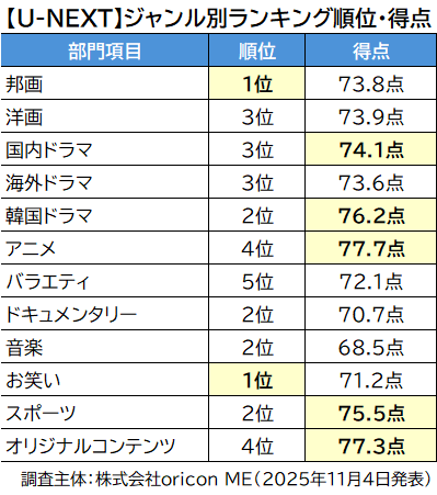 ジャンル別ランキングでは、「洋画」部門で2年連続6度目(2017~2018年、2020~2021年、2024~2025年)、「韓国ドラマ」部門では5年連続、「ドキュメンタリー」部門では2018年から8年連続の1位に。「オリジナルコンテンツ」部門では、1位を獲得した部門のなかで最も高い80.7点となり、2年連続6度目(2018~2021年、2024~2025年)の1位を獲得した。