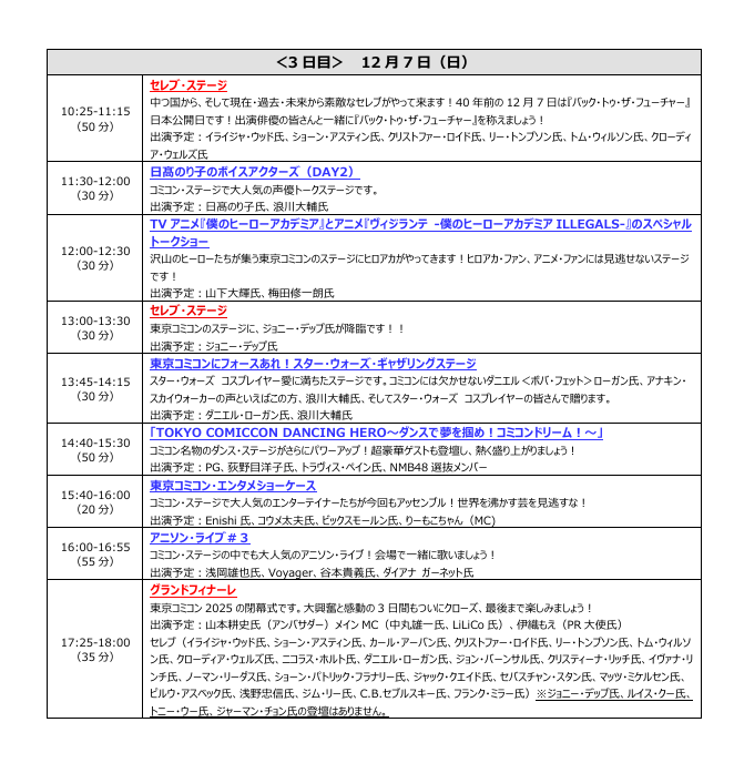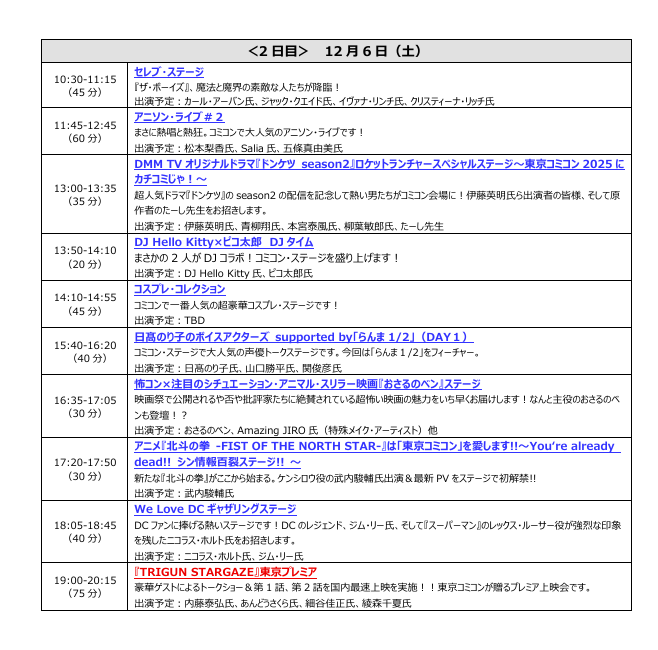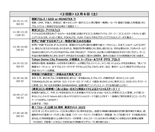 「東京コミコン2025」 特設リングステージ ステージスケジュール