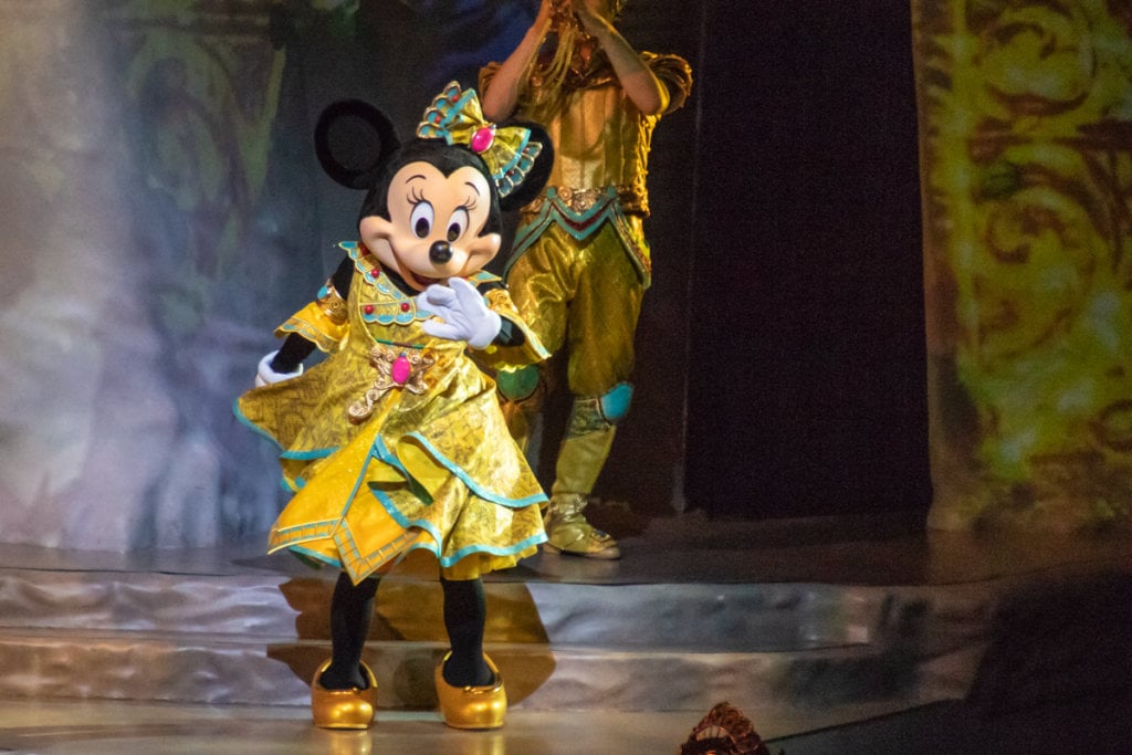 舞台は、植物の楽園や、クリスタルが光り輝く洞窟、川の流れる神秘的な遺跡と移り変わり、それぞれにミッキー、ミニー、ドナルド、グーフィーにスポットライトが当てられる編成だ。