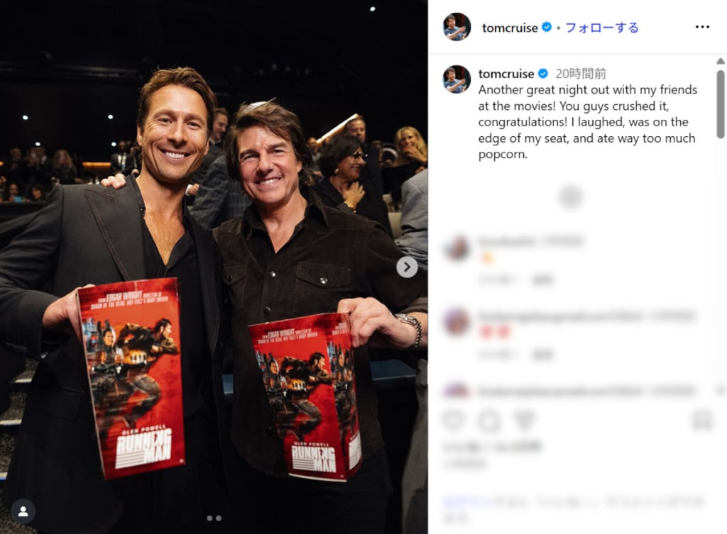 トム・クルーズも『ランニング・マン』大応援「ポップコーンを食べすぎちゃったよ」 ─ 『トップガン マーヴェリック』の二人が再会 「笑い転げて、ハラハラ」