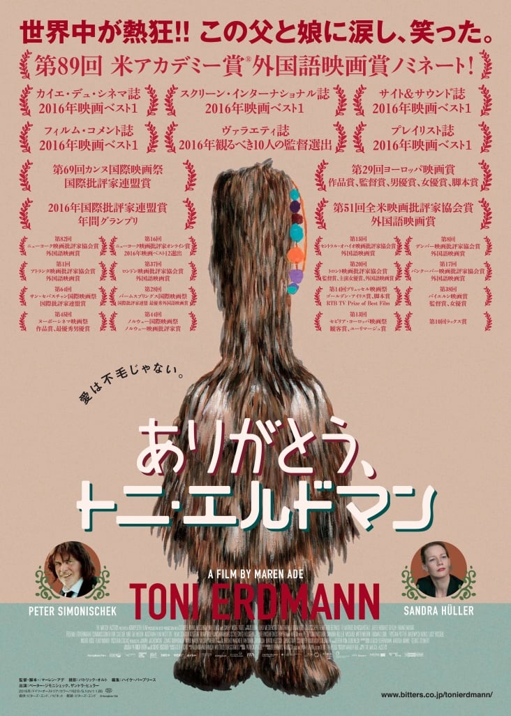 悪ふざけとイタズラが大好きな奇妙な父親と、今を生きることに必死なキャリアウーマンの娘。不器用な親子の関係性をユーモラスにエーモーショナルに描いたヒューマンドラマ。ドイツとフランスでは異例の大ヒットを記録し、40以上もの賞に輝いた話題作である。筆者は、この映画の満腹感に『ありがとう、トニ・エルドマン』と何度も何度も呟きたくなった。シュールな笑いがたくさん散りばめらていて、上映中、劇場内では四方八方からクスクスと笑い声が聞こえてきた。162分というやや長めの作品だが、観終わった後は爽やかな気持ちで劇場を出ることができた。