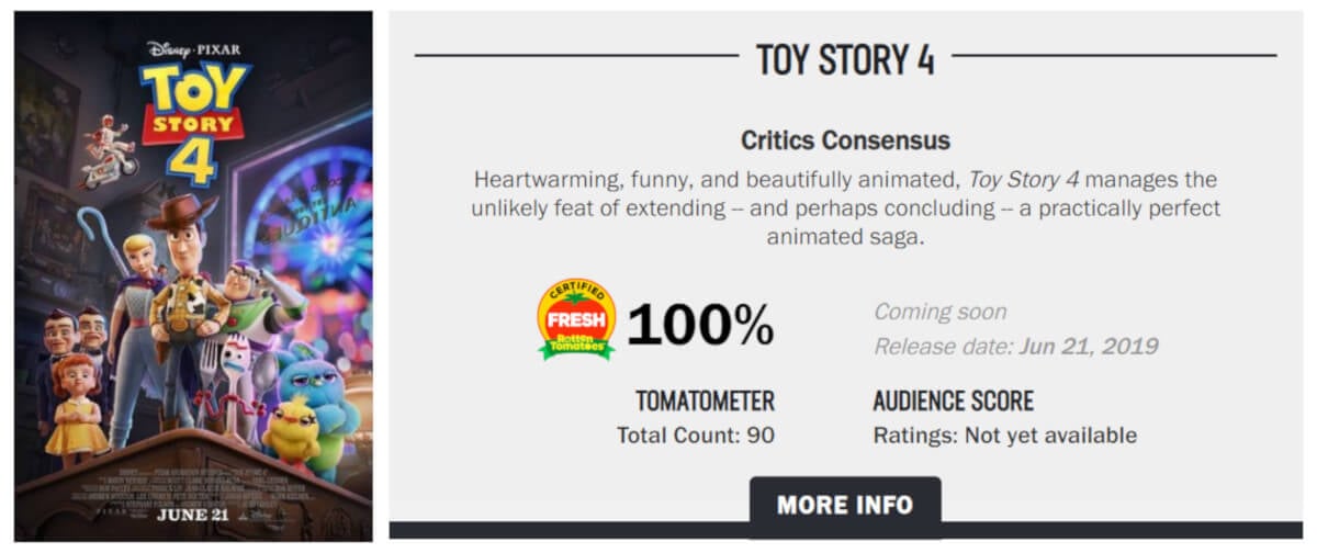 ディズニー/ピクサー映画『トイ・ストーリー4』の大絶賛が続いている。2019年6月21日の米国公開を直前に控えて、業界大手のレビューサイトRotten Tomatoesでは、批評家スコアで「100%」と記録する高評価。同サイトの基準を満たし、最高スコアのまま「認定フレッシュ(Certified Fresh)」入りを果たしたのである(2019年6月15日13:30現在)。