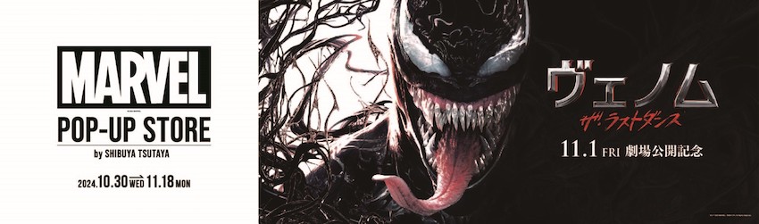 2024年11月1日より公開される映画『ヴェノム:ザ・ラストダンス』にあわせ、東京・渋谷のSHIBUYA TSUTAYA B1階にてポップアップストア「MARVEL POP-UP STORE by SHIBUYA TSUTAYA」が10月30日(水)~11月18日(月)の期間限定で登場する。