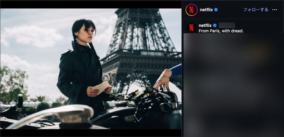 米NetflixのInstagramは、「パリより恐怖をこめて」とキャプションを添えて画像を投稿。パリのエッフェル塔を背景にするウェンズデー(ジェナ・オルテガ)と、バイクの上に乗ったハンドの姿が収められている。