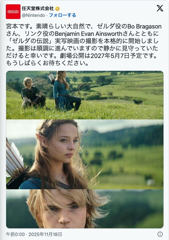 宮本です。素晴らしい大自然で、ゼルダ役のBo Bragasonさん、リンク役のBenjamin Evan Ainsworthさんとともに「ゼルダの伝説」実写映画の撮影を本格的に開始しました。撮影は順調に進んでいますので静かに見守っていただけると幸いです。劇場公開は2027年5月7日予定です。もうしばらくお待ちください。 pic.twitter.com/DbSAWWcCpC