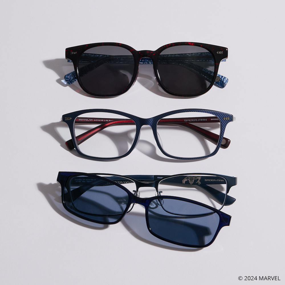 『スパイダーマン』のスーツを想起させるカラーの素材を採用。フロントがメタル素材のビジネスライクなメガネもラインアップ。